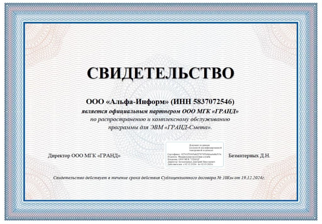 Наша компания, ООО «Альфа-Информ» уже 18 лет является официальным партнером Международной Группы Компаний ГРАНД. Мы работаем только с сертифицированным программным обеспечением.